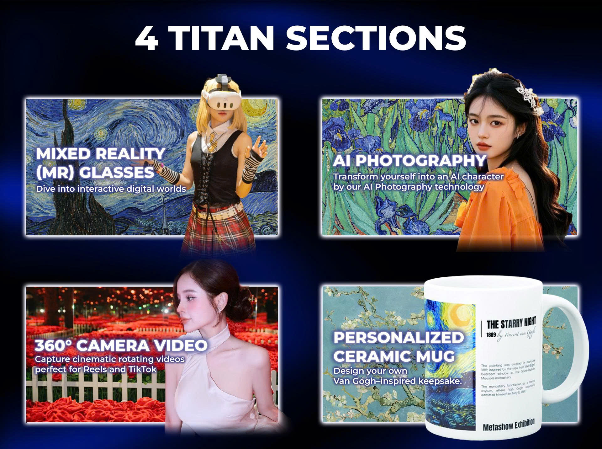Metashow là triển lãm nghệ thuật ánh sáng kết hợp công nghệ thực tế hỗn hợp (MR), trình chiếu 4K và nghệ thuật sắp đặt đa chiều, lấy cảm hứng từ thế giới hội hoạ của danh hoạ Vincent Van Gogh.