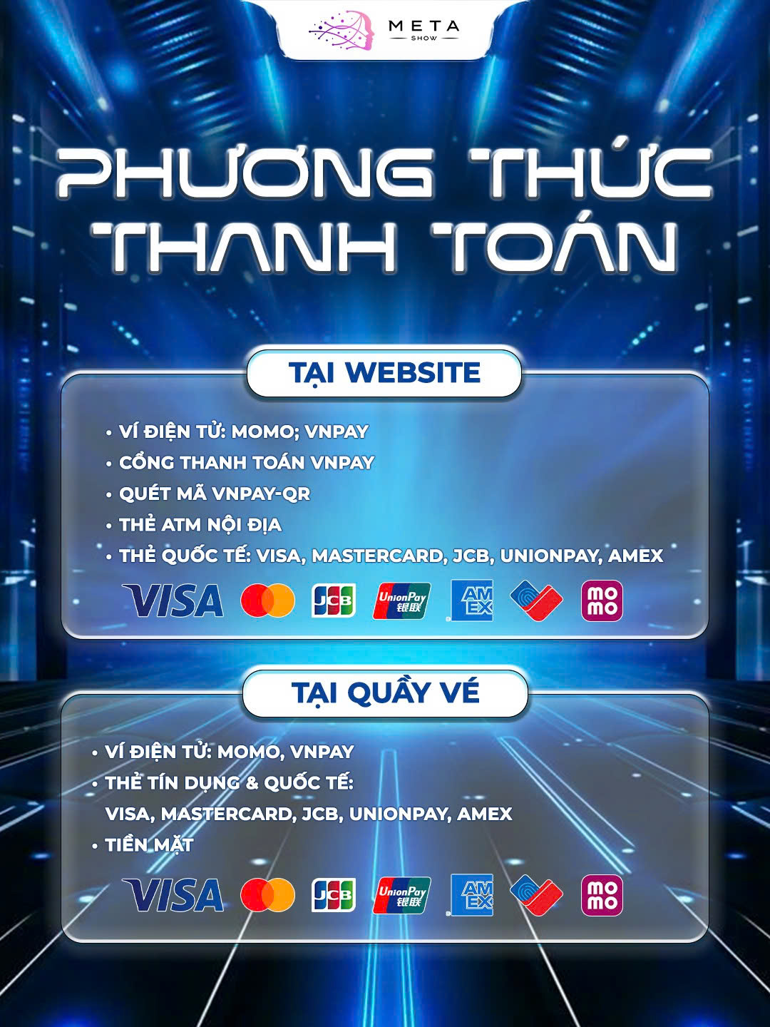 Để mang lại trải nghiệm thuận tiện nhất cho quý khách, Metashow cung cấp đa dạng các phương thức thanh toán linh hoạt cho cả hình thức đặt vé trực tuyến và mua vé trực tiếp tại quầy.